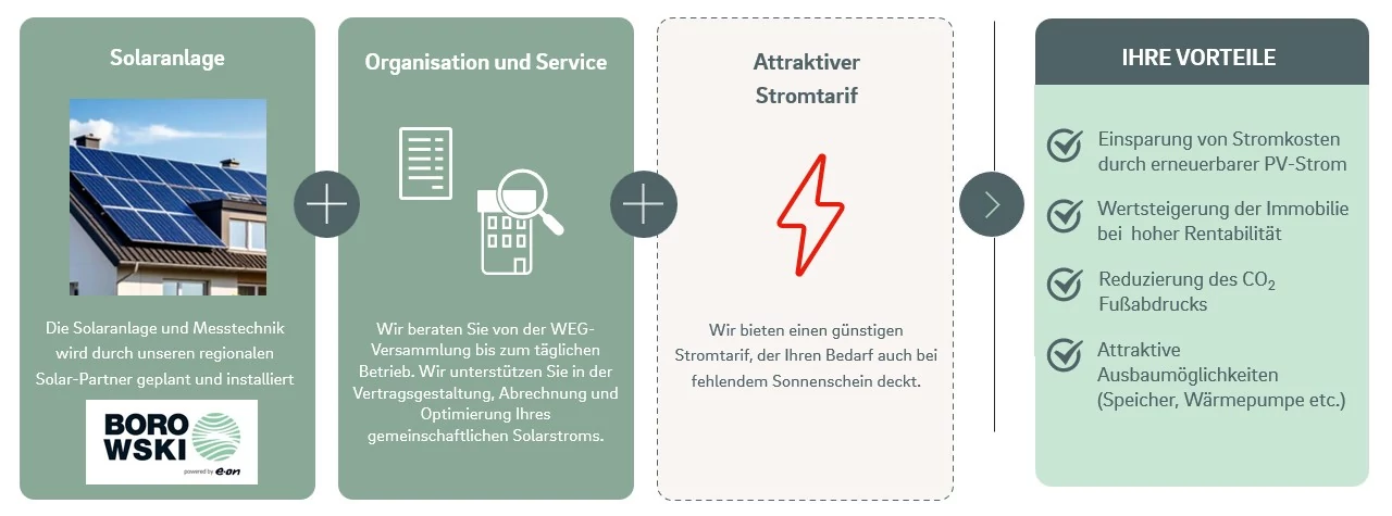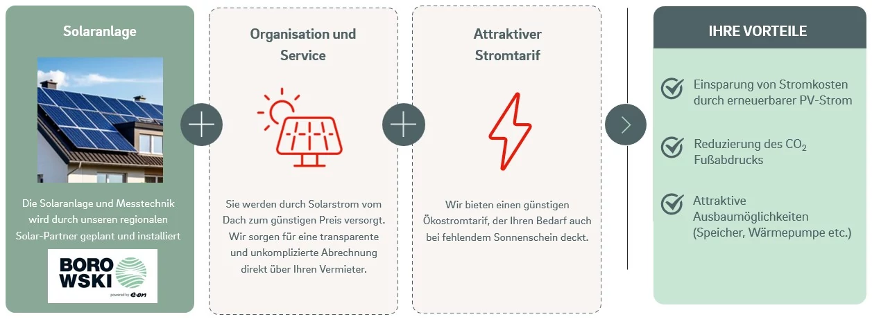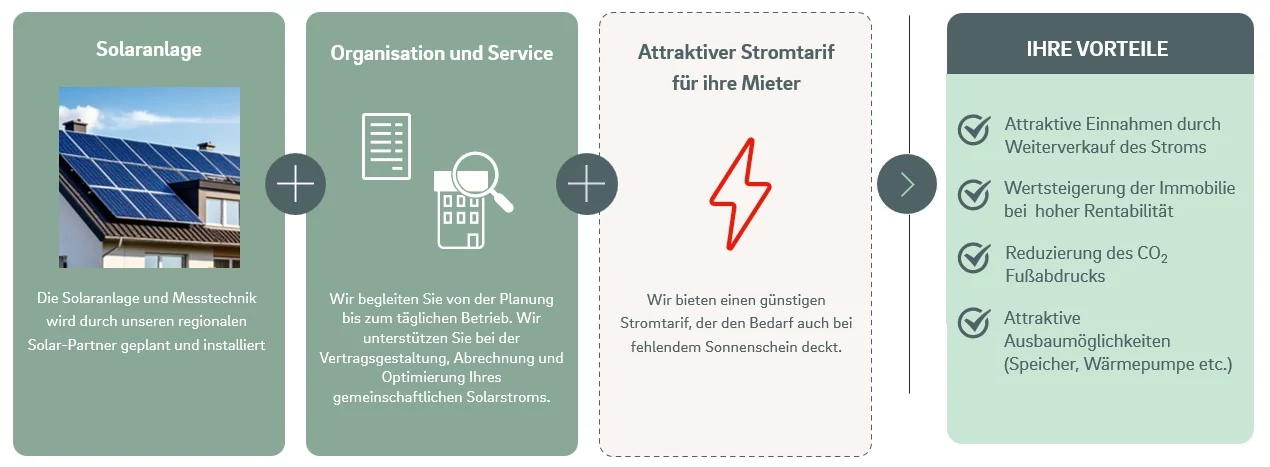Selbstbewohnende Eigentümer können den Strom dann direkt selbst nutzen, während vermietende Eigentümer den von „ihren“ Mietern verbrauchten Anteil an diese weiterverkaufen. Damit profitieren sowohl die Eigentümer selbst als auch die Mieter von günstigem, lokal produziertem Strom. Der nicht durch Solarstrom gedeckte Restbedarf wird wie gewohnt über einen separaten Stromtarif von einem Energieversorger gedeckt.