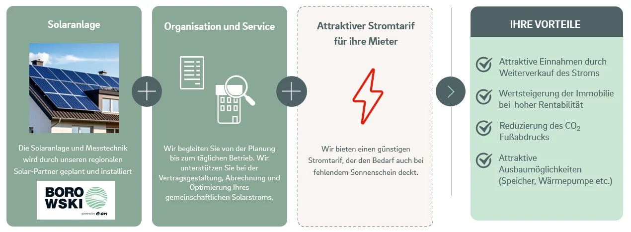 Ihr Mehrparteienhaus nutzt sauberen Solarstrom und die Eigentümer profitieren von konstanten Einnahmen und einer schnellen Amortisation.