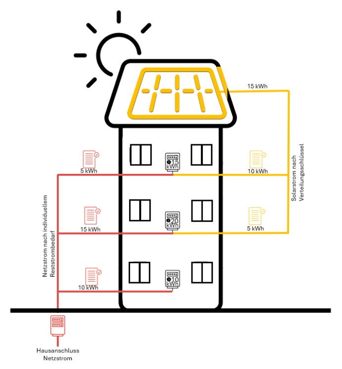 Bei der gemeinschaftlichen Gebäudeversorgung (GGV) wird durch die PV auf dem Dach Solarstrom erzeugt, und auf die teilnehmenden Wohneinheiten im Gebäude verteilt. Über festgelegte Verteilungsschlüssel wird bestimmt, wie viel Solarenergie jede Wohnung zugeteilt bekommt. Die Abrechnung erfolgt transparent über Ihren Vermieter oder den Anlagenbetreiber (in der Regel ist das der Gebäudeeigentümer oder eine beauftragte Firma) mithilfe installierter Smart Meter. Der Strombedarf, der nicht durch den Solarstrom gedeckt wird, kommt wie gewohnt aus dem öffentlichen Netz. Überschüssige Energie, die über den Verbrauch der Wohneinheiten hinausgeht, wird ins Netz eingespeist und verkauft.